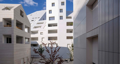 Der Wohnkomplex Ilot Queyries in Bordeaux vom niederländische Architekturbüro MVRDV ist in vielerlei Hinsicht außergewöhnlich - die prägnante keramische Außenhaut aber ganz besonders. Die Bauskulptur liegt östlich des Flusses Garonne, direkt gegenüber von Saint-André, einer der größten Kathedralen Frankreichs, die als städtebaulicher Hochpunkt das historische Zentrum von Bordeaux markiert. Mit dem Neubau wollten die Architekten das moderne Leben der prosperierenden Stadt widerspiegeln und machten den neuen Wohnhof, der eine parkähnliche Grünfläche einfasst, zum visuellen Orientierungspunkt im Quartier. Wie selbstverständlich schließt die Zukunft der Stadt auf diese Weise an die Historie an: Eine zeitgenössische Interpretation der Bautraditionen von Bordeaux. Dabei hat – wer an Keramikfassaden denkt – vermutlich fast jedermann zuerst kleine Häuser aus südlichen Ländern im Kopf. Die Dimensionen hier sind gänzlich andere und doch erweist sich das Material in vielerlei Hinsicht als richtige Wahl für Ilot Queyries. Der imposante Neubau sticht nicht nur mit seinen Höhen, Tiefen und Schrägen ins Auge. Auch die strahlend helle, dreidimensionale Gebäudehülle zieht schon von Weitem die Blicke auf sich. Unterschiedlich profilierte Fliesen des Systems KeraTwin von Agrob Buchtal machen das möglich. Sie fangen das Licht gekonnt ein und geben der Architektur mit Sonnenreflexen und Schattenspiel eine lebendige, skulpturale Anmutung, die sie zu einer keramischen Landmarke macht. Selbstbewusst greifen die gefliesten Fassadenflächen auch auf die Dächer über. Sie setzen sich mit scharfen, präzisen Kanten vom roten Putz des Innenhofes ab, der sich in Einschnitten, Durchblicken und Durchgängen hier und da kontrastreich seinen Weg nach außen bahnt. Für MVRDV ist das Projekt eine Art Labor der modernen Stadt, die Intimität mit Dichte, Ökologie, Licht und Komfort vereint. 200 m Gebäudelänge, 10 000 m² verbaute Keramikfassaden, die ihre Höhen bis auf neun Geschosse variieren und dabei eine dynamische Neigung von 14 bis 45 Grad einnehmen – ein Blick auf diese Eckdaten macht deutlich: Ohne die Unterstützung einer projektspezifischen und richtungsweisenden Oberflächengestaltung kann diese gleichermaßen unkonventionelle wie identitätsstiftende Architektur nur schwer gelingen. Nach den Vorgaben der Architekten gestalteten und produzierten Spezialisten von Agrob Buchtal eigens für Ilot Queyries Keramikelemente mit drei unterschiedlichen Profilen auf Basis des Fassadensystems KeraTwin. Das Ergebnis macht deutlich: Die wahre gestalterische Virtuosität von Keramik als Fassadenmaterial zeigt sich in der Kombination aus Farbe und dreidimensionaler Textur. Als Spielgefährtin des Lichts bringt sie eine fast unbegrenzte Zahl an Schattierungen in die monochrome Farbgebung. Abgesehen von kontextuellen und gestalterischen Erwägungen geht die helle Außenfarbe auch auf Umweltbelange zurück, um dem Gebäude eine hohe Albedo (Rückstrahlungsvermögen) zu verleihen, die dazu beiträgt, den städtischen Wärme-Insel-Effekt zu vermeiden. Und ohne Frage liegt einer der wichtigsten Parameter für nachhaltigen Städtebau auch in möglichst langen Gebäudelebenszyklen. Keramikfassaden von Agrob Buchtal sind dank Hytect-Technologie selbstreinigend. Somit erstrahlt Ilot Queyries auch dann noch in ästhetischem Glanz, wenn ein neuer Zeitgeist die futuristische Architektur überholt und man von ihr als historischer Bauskulptur im Quartier spricht. Oder anders ausgedrückt: Patina war gestern. Aber adelt eine solche denn nicht erst historisch wertvolle Baukultur? Die antibakteriell wirkenden Hytect-Fliesen kümmert’s nicht: Sie trotzen jeglicher Witterung, zeigen Moosen und Flechten die kalte Schulter und bauen zudem Schadstoffe wie Stickoxide ab, was der Luftqualität zugutekommt. Nicht einmal Frankreichs größte gotische Kathedrale, die Notre Dame d’Amiens mit ihrem 42,30 m hohen Mittelschiff, kann da noch mithalten … si