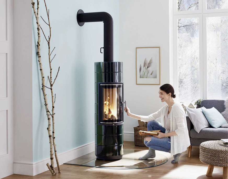 Leda stanzt Ofenteile nicht aus Blech, sondern gießt die einzelnen Elemente aus flüssigem Eisen. So auch beim kreisrunden Modell Peppa und bei der eckigen Variante Corna. Die schlanken Kaminöfen verfügen über eine Heizleistung von 4 bis 6 kW. Um Brennstoffverbrauch und Emissionen niedrig zu halten, hat der Hersteller einen Volumenstromregler entwickelt. Das Luftventil im Feuerraumboden stimmt Brennraum und Kaminsog aufeinander ab. Denn Länge und Querschnitt des vorhandenen Schornsteins beeinflussen seine Zugeigenschaften und somit den Luftstrom durch den Brennraum. Zu viel Luft sorgt für ein unruhiges Feuer, während bei zu wenig Luft das Holz nur unzureichend verbrennt. Der Volumenstromregler wird beim Aufstellen des Kaminofens eingestellt. Um einen sauberen Abbrand zu unterstützen, können die Kaminöfen zusätzlich mit einer elektronischen Heizhilfe ausgestattet werden. Sie zeigt den Betreiber:innen mit farbigen LED-Leuchten im Sockel an, ob Brennstoffmenge und eingestellte Verbrennungsluft optimal abgestimmt sind. Ein zusätzlicher Katalysator kann die Emissionen weiter mindern. jb