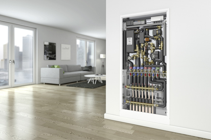 Über die FlatConnect lässt sich zentral erzeugtes Heiz- und Warmwasser bedarfsgerecht in die Verteilungsrohre einzelner Wohnungen eines Mehrfamilienhauses speisen. Zwei Leistungsstufen mit Zapfraten für Trinkwarmwasser von 15 und 20 l/min bieten die Roth Werke an. Verschiedene Grund-