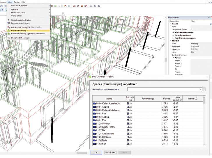 Für die TGA-Planungssoftware DDS-CAD gibt es ab der Version 15 eine Kühllastberechnung. Mit dem optional erhältlichen Modul lassen sich Kühllasten nach VDI 2078:2015-06 und auf Basis der Ashrae Heat Balance Method berechnen. Die Umsetzung der Kühllastberechnung erfolgt über eine bidirektionale Schnittstelle zu Esbo (Early Stage Building Optimization). Die von Equa entwickelte Anwendung für die Optimierung der Gebäudeplanung wurde auf die Arbeit mit DDS-CAD abgestimmt, damit sich die Projektdaten unkompliziert an das Berechnungsmodul übergeben bzw. die Ergebnisse der Kühllastberechnung in das Planungswerkzeug einbinden lassen. Eigenschaften von Lüftungsgeräten lassen sich in dem Kühllastmodul bedarfsgerecht anpassen. Zusätzlich zu konstanten Zuluftvolumenströmen können temperatur- oder CO2-geführte variable Volumenstromsysteme definiert werden. Für die Berücksichtigung von Glas- und Verschattungssystemen bietet eine Datenbank Zugriff auf die Artikel- und Materialdaten verschiedener Hersteller. Zusätzlich zur Ermittlung der Kühllasten nach Norm können mit dem Modul Simulationen durchgeführt werden – etwa um den Komfort in einem Raum oder den Energiebedarf eines Gebäudes detailliert zu prüfen. Die Erzeugersysteme des Gebäudes sowie die Übergabesysteme in den Räumlichkeiten (Bauteilaktivierung, Ventilatorkonvektoren, Fußbodenheizung etc.) lassen sich differenziert abbilden.