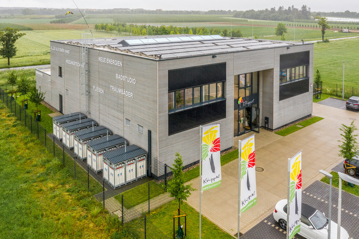 Südlich von Bonn hat die G Josef Küpper Söhne GmbH mit ihrem nun dritten Firmenstandort Meckenheim ein nigelnagelneues Badstudio eröffnet, in dem sich frisch gebackene Baufrauen und Bauherren auf 450 Quadratmeter Ideen für ihren noch in Planung oder im Rohbau befindlichen Wellnesstempel holen können. Meistens reicht’s am Ende dann doch nur für ein ordentlich gestaltetes Bad, zumal das Baubudget für ein effizientes energetisches Konzept in jedem Fall besser als für Dusch-WCs oder Whirlpools angelegt ist. Die Küppers – die ihr Unternehmen seit 1919 immerhin nun schon in vierter Generation führen – machen’s selbst vor: Sie haben mit dem neuen Firmengebäude die nach eigenen Aussagen bundesweit erste Gewerbeimmobilie auf die Wiese gesetzt, die sich völlig autark dank am Gebäude produzierten, grünen Wasserstoff mit Wärme, Kälte und Strom versorgt. Die Komponenten sind schnell aufgezählt: PV-Module auf dem Flachdach und an den Fassaden erbringen 98 kWp Leistung und füttern mit dem Solarstrom die Picea-Energiezentrale, die den Gleichstrom in Wechselstrom für Beleuchtung, die IT-Infrastruktur sowie alle weiteren elektrischen Geräte umwandelt. Auch die Batterien der elektrisch angetriebenen Firmenflotte werden mitversorgt – insgesamt zehn Ladesäulen sind dafür installiert. Nicht zu vergessen die an zwei 130 m tiefe Erdsonden angeschlossene Wärmepumpe mit 17,5 kW Heizleistung, die auch von Picea versorgt wird, um über die Fußbodenheizung sommers wie winters (siehe Grafiken) das Klima im Schauraum und in den Büros im angenehmen Temperaturbereich zu halten. Der in der Regel im Sommer anfallende Solarstromüberschuss wird in einer 125 kW fassenden Batterie gespeichert, mittels Elektr ...
