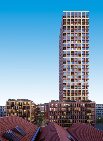 Böse Zungen behaupten ja, das knappe Bauland in der kleinen Schweiz lasse den Eidgenossen keine andere Chance, als in der Höhe das Weite zu suchen. Was natürlich so nicht stimmt, denn das Alpenland macht uns auch in der Fläche immer wieder vor, wie sich hochwertige und nachhaltige Architektur zu einem vorbildlichen Städtebau fügen lässt. Bestes Beispiel: das neue Wohn- und Arbeitsquartier Lokstadt in Winterthur. Ein 120 000 m² umfassendes Areal, auf dem von 1850 bis 2010 Lokomotiven und Züge für die Schweizer Bundesbahnen produziert wurden, darunter auch die erste elektrische Gotthard-Lokomotive Krokodil. Dieser und mehr Lokomotivnamen stehen Pate für die verschiedenen Bauabschnitte in dem 2000-Watt-Areal, die 2025 mit dem Gebäudekomplex Rocket und Tigerli den Abschluss finden sollen. Rocket hieß übrigens die weltweit erste Dampflok, die 1829 in Serie ging – in der Lokstadt hat das Immobilienunternehmen Ina Invest Holding das derzeit weltweit höchste in Planung befindliche Wohngebäude aus Holz auf diesen Namen getauft. Der Siegerentwurf des Kopenhagener Büros Schmidt Hammer Lassen Architects mit Cometti Truffer Hodel Architects aus Luzern basiert mit seinem städtebaulichen Ansatz auf einem gemischt genutzten Sockelbau („Tigerli“) und dem 32 Stockwerke bzw. 100 Meter aufragenden Holzhochhaus „Rocket“. Alle 255 Wohneinheiten mit 1,5 bis 5,5 Zimmern verfügen über Balkon oder Loggia, wobei die künftigen Bewohner zwischen mehreren Wohnmodellen wählen können, die sich an den Bedürfnissen unterschiedlicher Lebensstile orientieren. Der hölzerne und mit Terracotta bekleidete Wohnturm wird die Winterthurer Skyline als Landmarke überragen und vom öffentl ...