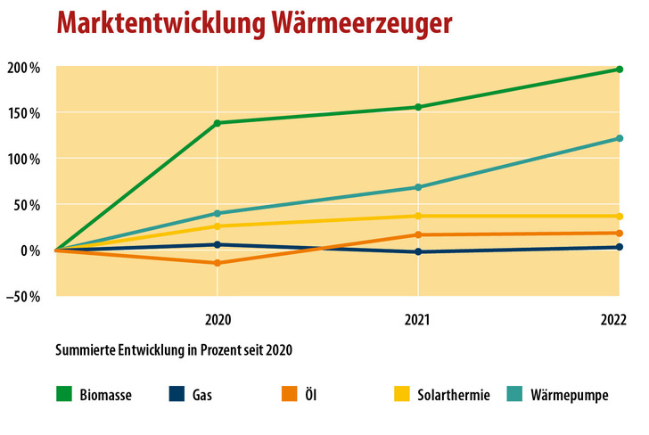 Die Entwicklung der eingebauten Biomasseheizanlagen, unterstützt durch den Fakt, dass Pelletspreise mit den fossilen Heizstoffen nicht nur mithalten können, sondern eine echte Alternative darstellen, zeigt weitere Möglichkeiten des nachhaltigen Heizens. So soll nach einem Bericht des Bundeswirtschaftsministeriums die Wärmeerzeugung aus Geothermie, Großwärmepumpen und Solarthermie bis 2026 mit rund drei Milliarden Euro unterstützt werden. Das könnte neuen Aufschwung geben. fk Erneuerbare gewinnenSeit 2020 legen Biomassekessel und Wärmepumpen am stärksten zu. Die Entwicklung liegt in Gesamtsumme aber weit hinter dem Top-Heizer Gas. So wurden 2022 in Deutschland 89 000 Biomasseheizanlagen und 236 000 Heizungs-Wärmepumpen eingebaut. Dagegen waren es 598 500 Gas-Wärmeerzeuger. Dennoch ist die Entwicklung bei Biomasse beachtlich. In drei Jahren stieg die Menge der jährlich eingebauten Bio-Heizanlagen um fast 200 Prozent. Energieträgerpreise steigen und fallenEin gemeinsamer Trend ist für die Preise von Erdgas, Heizöl und Holzpellets im vergangenen Jahr zu erkennen. So bezahlten Verbraucherinnen und Verbraucher für jeden der Energieträger zu Hochzeiten im Herbst 2022 einen doppelt so hohen Preis wie zu Beginn des Jahres. Basis: Verbraucherpreise für die Abn ...