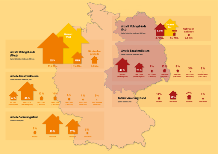 Nach aktuell vorliegenden Daten beläuft sich der Wohngebäudebestand in den neuen Bundesländern auf rund 3,4 Millionen Gebäuden. In den alten Bundesländern beträgt er 16 Millionen. Dabei kommen in den westlichen Bundesländern rund 5,2 Ein- und Zweifamilienhäuser (EZFH) auf ein Mehrfamilienhaus (MFH). In den östlichen Bundesländern liegt das Verhältnis zwischen EZFH und MFH lediglich bei knapp vier. Zudem sind in der ehemaligen DDR Nichtwohngebäude nicht nur in der Gesamtanzahl, sondern auch anteilig weniger dicht vertreten. Mit 20,9 Nichtwohngebäuden pro 1.000 Einwohnern gibt es anteilig rund vier Gebäude weniger als im Westen von Deutschland (24,4 pro 1.000 Einwohner). Bei den Baualtersklassen zeigt sich, dass der größte Teil der Wohngebäude in den neuen Bundesländern vor 1945 gebaut wurde. In den alten Bundesländern ist die Baualtersklasse von 1946 bis 1978 am häufigsten vertreten. Trotz des größeren Anteils älterer Gebäuden zeigt sich der Sanierungsstand im Osten als ausgeprägter. Sowohl in der Kategorie Neubau als auch in der Kategorie vollsaniert liegt er vorne. Die Bundesländer Mecklenburg-Vorpommern und Brandenburg machen mit 18 und 19 Prozent in der Kategorie Neubau den mit Abstand größten Anteil aus. Das bedeutet: Beide Teile des Landes stehen vor ihren eigenen Herausforderungen. Die alten Bundesländer müssen ihre große Anzahl an Nachkriegsbauten sanieren. An den neuen Bundesländern liegt es, die vielen sehr alten Gebäude auf den aktuellen Stand zu bringen. fk