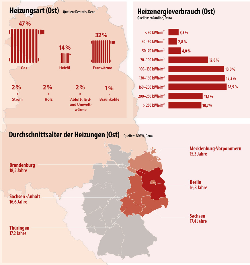 Was das Alter der eingebauten Heizungsanlagen angeht, ist ebenfalls kein bestimmtes Muster zu erkennen. Ob in Ostdeutschland mit durchschnittlich 17 Jahren oder in Westdeutschland mit durchschnittlich 17,4 Jahren – die meisten von ihnen laufen schon recht lange und gehören in den kommenden Jahren ausgetauscht. Dann hoffentlich gegen eine klimafreundliche Alternative. Damit die fossilen Energieträger nicht weiterhin das Geschehen in den Heizungskellern bestimmen. jb