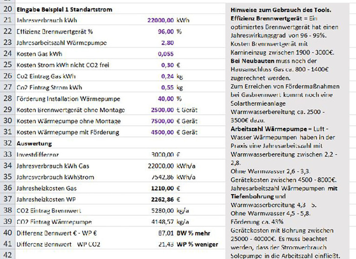 Ein einfaches Rechentool, mit dem sich die Verbrauchskosten einer Wärmepumpenheizung mit denen eines Gas-Brennwertgeräts vergleichen lassen, hat der Sachverständige und Energieberater Bernd Wulfestieg entworfen. Mit dem Rechentool will er unter anderem für seinen Vorschlag werben, den Verbrauchsstrom für Wärmepumpen zu fördern. „Als Berater kann ich dem Endverbraucher eine Umstellung auf Wärmepumpen zurzeit nicht empfehlen“, erläutert Wulfestieg. Bei den aktuellen Strompreisen zwischen 0,29 und 0,31 Euro pro Kilowattstunde lägen die Heizkosten einer Wärmepumpe 50 bis 70 Prozent über denen einer Gas-Brennwertheizung. Auch die Investitionskosten für eine Wärmepumpe lägen trotz Förderung bis zu 60 Prozent über einem Gas-Brennwertkessel. Um bei der Heizungssanierung bestehen zu können, brauche es deshalb Unterstützung für die Wärmepumpe. Denn mit CO₂-freiem Strom betrieben könnten die elektrischen Heizgeräte deutschlandweit acht bis 20 Millionen Tonnen Kohlendioxid im Jahr einsparen. jb