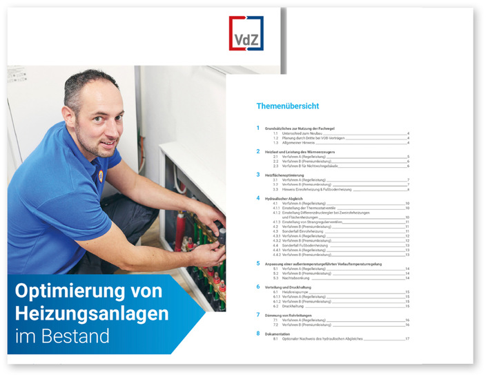 Ob im Zuge einer Sanierung oder bei der Begutachtung einer Anlage – eine energieeffizient arbeitende Heizung setzt die optimale Abstimmung des Systems voraus. Das gilt in Einfamilienhäusern genauso wie in Büro- oder Schulgebäuden. Deshalb hat die VdZ Wirtschaftsvereinigung Gebäude und Energie ihre Fachregel „Optimierung von Heizungsanlagen im Bestand“ um ein Kapitel zu Nichtwohngebäuden erweitert. Es erleichtert Fachhandwerker:innen, das entsprechende Nachweisformular zu nutzen. Die Fachregel gibt detaillierte Informationen zu den erforderlichen Leistungsumfängen nach Verfahren A und B und setzt in Verbindung mit den Bestätigungsformularen zum hydraulischen Abgleich einen technischen Standard. Die Nachweisformulare zur Bestätigung des hydraulischen Abgleichs hat die VdZ gemeinsam mit dem BAFA und der KfW entwickelt. jb