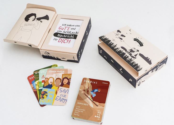 Spielerisch herausfinden, wo jeder etwas im Alltag für den Klimaschutz tun kann. Dazu braucht es nur die 38 Spielkarten und zehn Sonderkarten des Klimaquartetts. Mit jedem Spielzug zeigt sich, wie sich Wohnen, Ernährung, Transport, Urlaub, Hobby, Strom und Konsum auf die Umwelt auswirken. Wer mag, spielt nach den klassischen Quartett-Regeln. Dann gehen zum Beispiel das Hobby Wandern und der Urlaub auf den Malediven ins Rennen. Fünf Sonder- und fünf Extrakarten bringen extra drive ins Spiel. Sie bilden Phänomene unserer Zeit ab: Akute Bedrohungen des Klimawandels wie Dürre, Eisschmelze oder Müll treten Klimaheld:innen, aber auch Klimawandelleuger:innen gegenüber. Die Karten werden neu gemischt – wie im echten Leben. Die für das liebevoll gestaltete Kartenspiel verwendeten Zahlen beruhen auf einer aufwändigen Recherche. Naturwissenschaftler:innen von der Universität Ulm haben sie ergänzt und auf Plausibilität geprüft. Um die Werte spielbar, emotional und intuitiv erlebbar zu machen, hat sie das Entwicklerteam in eine Skala von 0 bis 6 umgewandelt und als Symbole illustriert. Ohne belehrend zu wirken gelingt es dem Klimaquartett, die eigene Verantwortung in den Mittelpunkt zu rücken. jb