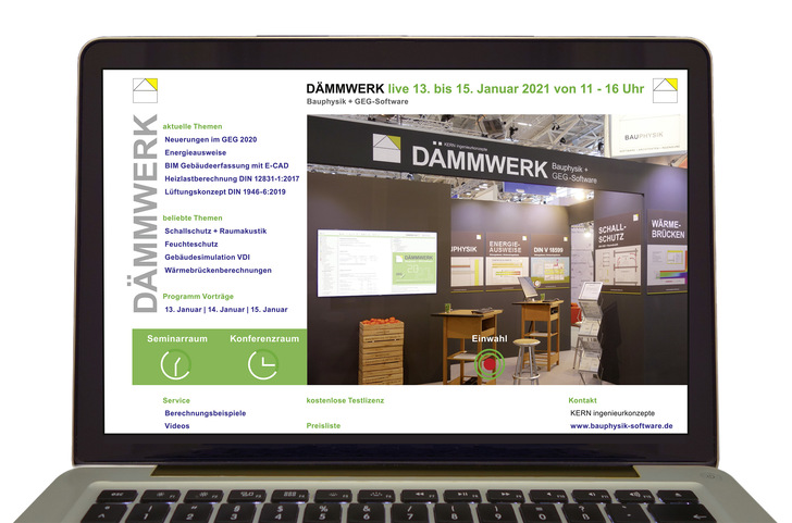 Weil die Leitmesse Bau 2021 nicht in gewohnter Weise stattfinden kann, lädt der Softwarehersteller Kern Ingenieurkonzepte vom 13. bis 15. Januar 2021 zu einem unbeschwerten und kostenlosen Online-Rundgang im World Wide Web ein. Anhand und mithilfe der Bauphysik- und GEG-Software Dämmwerk 2021 präsentiert das Unternehmen derzeit viel diskutierte Themen, wie das neue Gebäudeenergiegesetz (GEG), die Berücksichtigung von lokalen Photovoltaikanlagen, die vereinfachten Nachweisverfahren nach § 51, die Bilanzierung von thermischen Solaranlagen oder die Berechnung von Wärmepumpen.