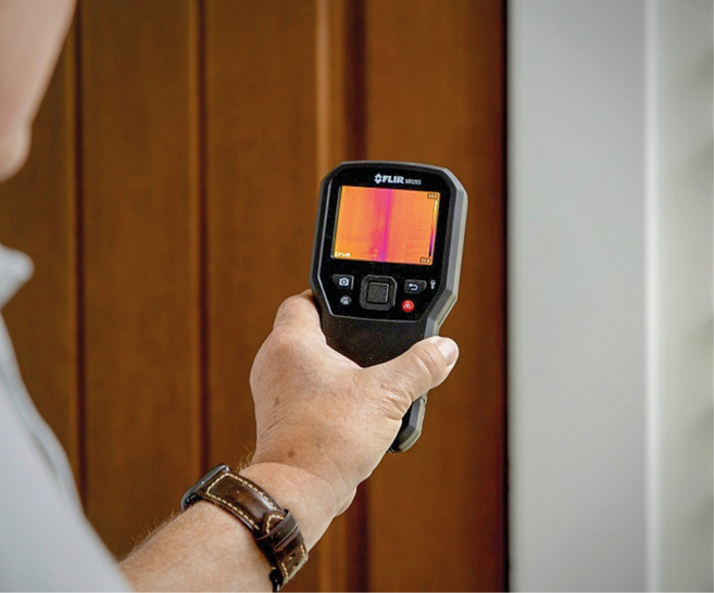 Das Feuchtemessgerät MR265 von Flir kann auch Wärmebilder aufnehmen. Es arbeitet außerdem mit MSX. Die Technik ergänzt Wärmebilder mit physischen Details, wie Kanten- und Umrisse. Das Kombigerät ist darauf ausgelegt, große Bereiche u. a. auf Elektroschäden, Feuchtigkeit und Luftlecks zu scannen. Es ermöglicht Fachkräften, z. B. Wasserlecks aufzuspüren und zu lokalisieren. Mit der Wärmebildtechnik lässt sich eine komplette Innenwand erfassen, um z.B. die feuchte Stelle einzugrenzen, mithilfe des integrierten Sensors die Quelle des austretenden Wassers zu identifizieren und die exakte Menge der Feuchtigkeit zu messen. Über ein mitgeliefertes USB-Kabel können die Wärmeaufnahmen hochgeladen werden. Mithilfe der Geräte-Software lassen sich Wärmebild-, MSX- oder Vorher- und Nachher-Berichte erstellen. jb