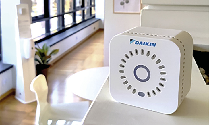 Die Bedeutung einer guten Raumluftqualität für die Gesundheit ist nicht erst seit der Corona-Pandemie bekannt. Ein zu hoher CO₂-Gehalt beispielsweise kann Kopfschmerzen oder Konzentrationsschwäche verursachen. Außerdem steigt mit ihm die Zahl an Aerosolen und Keimen. Mit dem IAQ-Sensor von Daikin lässt sich die Raumluftqualität messen und auswerten, z. B. in Einzelhandelsgeschäften, Gewerbe- und Industriegebäuden, Restaurants oder Schulen. Mit seinen zwölf integrierten Sensoren erfasst das Gerät 15 Qualitätsparameter, außer dem CO₂-Gehalt u. a. den Feinstaubanteil und die Luftfeuchtigkeit. Überschreiten die Parameter ihren jeweiligen Schwellenwert, sendet das Überwachungsgerät eine Warnmeldung. Je nach Örtlichkeit kann es eine Raumgröße mit einer freien Fläche von etwa 200 m2 vermessen. Einrichten und konfigurieren lässt es sich mit der Airsense-App. Über ein WLAN-Netzwerk oder die NarrowBand-IoT-Technologie verbindet sich das Gerät mit der Daikin-Plattform Caelum, in der sich der Raumluftstatus in Echtzeit ablesen lässt und Berichte erstellt werden können. jb