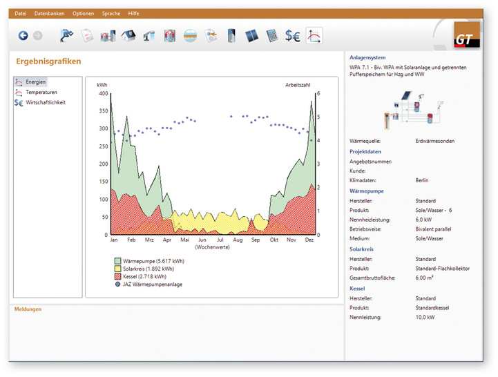 Das Simulationsprogramm GeoT*SOL von Valentin Software berechnet Luft-, Sole- und Wasserwärmepumpen. Für die Simulationen lassen sich Luft, Erdwärmesonden bis 100 m, Grundwasser oder im Erdreich verlegte Erdkollektoren als Wärmequellen eingeben. Die neue Programmversion bietet zudem Nachweise nach dem bundesweiten Gebäudeenergiegesetz und dem Erneuerbare-Wärme-Gesetz in Baden-Württemberg. Neben der Arbeitszahl einer Wärmepumpe ermittelt GeoT*SOL die Jahresenergieerträge, die Schadstoffreduzierung und die Wirtschaftlichkeit. Ergebnisse, wie die Jahresverläufe der relevanten Temperaturen, der Nutzwärme und der elektrischen Energie sowie die Wochenarbeitszahlen, stellt es grafisch dar. Bei der Auslegung eines Systems können Sie zwischen verschiedenen vordefinierten praxisbewährten Anlagenkonfigurationen wählen. Neben monovalenten Anlagen können Sie auch bivalente Systeme simulieren. Das Programm hält dafür eine Produktdatenbank mit annähernd 1.600 Wärmeerzeugern und eine Speicherdatenbank mit 600 Einträgen bereit. Über eine Schnittstelle zum PV-Simulationsprogramm PV*SOL lässt sich außerdem der von einer Photovoltaikanlage direkt an die Wärmepumpe gelieferte Strom ermitteln. jb
