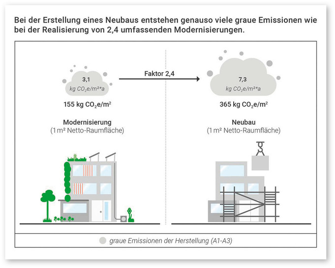 Ist ein saniertes Gebäude umweltfreundlicher als ein Neubau? Mit dieser Frage beschäftigt sich eine Kurzstudie der Deutschen Gesellschaft für Nachhaltiges Bauen (DGNB). Sie analysiert insgesamt 19 DGNB-zertifizierte Sanierungsprojekte, meist Büros und Verwaltungsgebäude. Die Ergebnisse zeigen, dass die bauwerksbezogenen grauen Emissionen bei den Sanierungen bis zu zwei Drittel geringer ausfallen als bei Neubauten. Die Studie stützt sich dabei auf Referenzwerte aus einer früheren Untersuchung der DGNB zu Treibhausgasemissionen. Da Sanierungsumfang, gewählter Energieträger und die daraus resultierenden CO2-Emissionen der Maßnahmen variierten, sind die Ergebnisse projektspezifisch zu betrachten. Jedes Projekt benötigt eine individuelle Analyse, um bestmöglich CO2 zu reduzieren. Die vollständige Kurzstudie steht auf der Webseite der DGNB zur Verfügung. ar