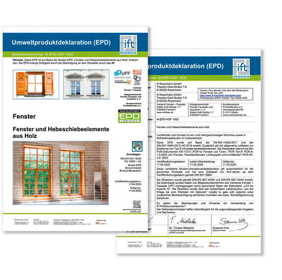 Das ift Rosenheim hat zusammen mit dem Verband Fenster + Fassade, der RAL Gütegemeinschaft Fenster, Fassaden und Haustüren sowie dem Bundesverband Pro Holzfenster Muster-Umweltdeklarationen für Fenster, Türen und Fassaden erstellt. Sie sollen Herstellern den Nachweis der Nachhaltigkeit ihrer Bauprodukte vereinfachen. Eine Umweltproduktdeklaration (Environmental Product Declaration, EPD) stellt die Umweltwirkungen eines Bauprodukts über dessen Lebenszyklus dar. Die Muster-EPD basieren auf Durchschnittswerten aus einem Unternehmensdatenpool und sind fünf Jahre gültig. Um sie auf ein eigenes Produkt zu übertragen, muss lediglich ein Fragebogen ausgefüllt werden. Mitglieder der Verbände erhalten die EPD zu reduzierten Kosten. Auch firmenspezifische EPD oder der IFT-Nachhaltigkeitsproduktpass sind verfügbar. ar