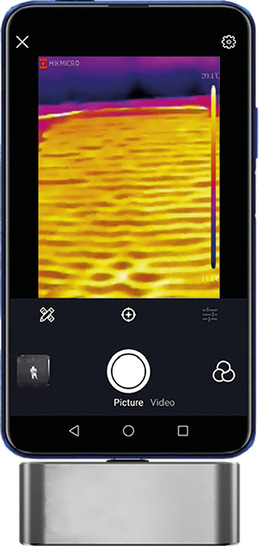Mit der Mini1 machen Sie Ihr Android-Smartphone zur Wärmebildkamera. Hikmicro hat das Modul für eine einfache und schnelle Temperaturmessung konzipiert. Mit ihm lassen sich elektrische Geräte ebenso begutachten wie Heizungs-, Kühl- oder Lüftungsanlagen und verdeckte Wasserleitungen entdecken, mangelhafte Isolation finden oder die Temperaturverteilung einer Fußbodenheizung prüfen. Angeschlossen wird es über die USB-Type-C-Schnittstelle. Es bietet eine Auflösung von 160 × 120 Pixeln und wiegt 26 g. Mit der mitgelieferten App können Sie die Wärmebilder direkt auf dem Android-Smartphone ansehen. Die Mini1 ist mit einem Vox-Detektor mit festem Fokus (Sichtfeld/FOV 50° × 38°, H × V) ausgestattet. Der Messbereich reicht von -20 bis 350 °C. Die Messgenauigkeit beträgt ±2 °C im Temperaturbereich von –20 bis 100 °C und ±2 % zwischen 100 und 350 °C. Dank seiner Bildwiederholfrequenz von 25 Hz liefert das Modul klare, ruckelfreie Bilder. Das ist ebenfalls sinnvoll bei Filmen, die im MP4-Format möglich sind und die wie die Wärmebilder direkt auf dem Smartphone gespeichert werden können. jb