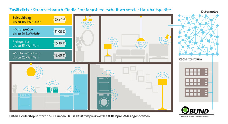 Der BUND weist im Zusammenhang mit der zunehmenden Vernetzung in den Haushalten auch auf datenschutzrechtliche sowie auf mögliche gesundheitliche Auswirkungen durch elektromagnetische Felder hin, die aber nicht Gegenstand der Studie waren. GLR