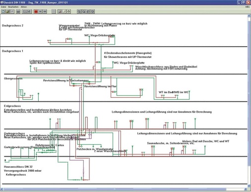 „Für Energieberater kann es im Rahmen der Beratungstätigkeiten sinnvoll sein, neben den Berechnungen zum Wärmebedarf weitere Planungsbereiche abzudecken. So z. B. die Berechnung der Heizlast nach DIN EN 12831, das Auslegen von Heizkörpern und Wand- oder Fußbodenheizungen sowie die Berechnungen zum hydraulischen Abgleich. Ein Programm mit dem u. a. die oben genannten Berechnungen durchgeführt werden können, ist das Programm Dendrit LT, auch mit den Modulen für Entwässerungstechnik nach DIN 1986 & DIN EN 12056 und für Trinkwasseranlagen nach DIN 1988. Dieses Programm ist eine abgespeckte Version und kann für 41,65 €/mtl. gemietet werden. Die Miete kann auch projektbezogen, d. h. für ein begrenztes Zeitfenster erfolgen. Mit Dendrit LT lassen sich Wohngebäude bis zu einer Größe von ca. sechs bis acht Wohnungen berechnen und mit einem Strangschema darstellen. Allerdings sind zur Bedienung des Programms vertiefte Kenntnisse der Versorgungstechnik notwendig“