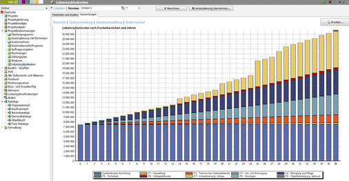 Den Lebenszyklus-Bezug erhalten die Bau- und Anlagenelemente durch eine Verknüpfung mit Informationen zu Serviceleistungen für Reinigung, Wartung und Instandsetzung in der Nutzungsphase – inklusive den jeweiligen Kosten und zeitlichen Zyklen – sowie Daten zur Beseitigung oder zum Recycling. Die Daten für Reinigungsintervalle, Wartungs- und Instandhaltungszyklen basieren auf Projektauswertungen, Herstellerempfehlungen, gesetzlichen Vorgaben, Normen und Richtlinien. Damit verfügt das Gebäudemodell über alle notwendigen Informationen zur Ermittlung der Lebenszykluskosten. Über eine grafische Auswertung der Folgekosten im zeitlichen Verlauf der Bauwerksnutzung lassen sich Kostenverursacher im Projekt identifizieren und dadurch Optimierungen vornehmen.