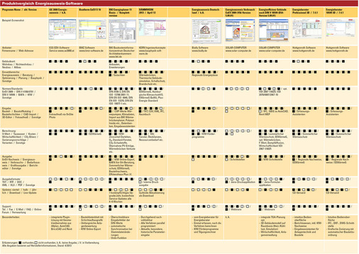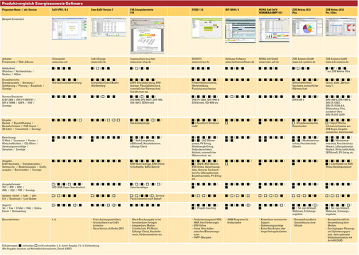 Für die Marktübersicht wurden die Anbieter der Programme nach Eigenschaften ihrer Energieberatungs-Software gefragt. Nach mehr als zehn Jahren Marktverfügbarkeit unterscheiden sich viele Produkte weniger im Funktionsumfang, als durch den Bedienungskomfort, die Benutzeroberfläche und Bedienungsabläufe. Daraus resultierende Vor- und Nachteile treten erst beim praktischen Arbeiten mit der Energieberater Software zutage – also erst nach dem Kauf, wenn die Entscheidung bereits gefallen ist. Diese „weichen“ Programmkriterien lassen sich jedoch nur schwer im Rahmen eines tabellarischen Produktvergleichs abfragen. Deshalb sollte man nicht nur darauf achten, ob die Software alle Funktionsanforderungen erfüllt, sondern auch, wie sich die Arbeit mit der Software „anfühlt“, zum Beispiel wie einfach und intuitiv oder kompliziert und umständlich sind die Arbeitsabläufe? Wie gut ist die Software auf die Bedürfnisse von Energieberatern zugeschnitten? Das lässt sich nur mit einer Testversion und am konkreten Projekt überprüfen.