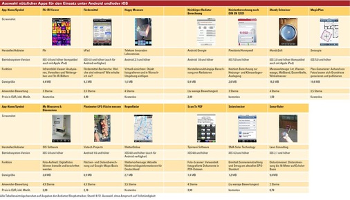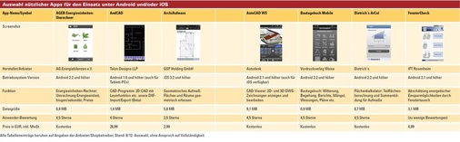 Inzwischen gibt es auch branchenspezifische Entwicklungen: So bieten Bausoftware-Hersteller mobile CAD-, Aufmaß-, Zeiterfassungs- oder Controlling-Lösungen – entweder als funktional abgespeckte Version einer schon vorhandenen Bürolösung, als Ergänzung oder als eigenständige Entwicklung. Natürlich gibt es auch Apps rund um die Gebäudeenergieberatung. Dazu gehören z. B. ein Fenster-Check zur Abschätzung energetischer Einsparmöglichkeiten durch einen Fenstertausch, eine Fördermittel-App oder eine Heizlast-Berechnung. Hausbesitzer bzw. Verbraucher erhalten beispielsweise mit den Apps „Energieberatung“ oder „HEA Energietipps“ Infos zum Energieausweis, zu Förderprogrammen, zur Energieberater-Regionalsuche bzw. Tipps zum Energiesparen. Zu den häufigsten herstellerspezifischen Apps gehören Produktkataloge, technische Produktinformationen, Montage- oder Verarbeitungshinweise, Auslegungs- und Berechnungswerkzeuge, aber auch Online-Planer oder Konfigurations-Tools. Nachteil herstellerspezifischer Apps ist, dass sie ausschließlich auf die jeweilige Produktpalette zugeschnitten sind. Die Übersichtstabelle listet, alphabetisch sortiert und ohne Anspruch auf Vollständigkeit, eine Auswahl nützlicher, unter Android und/oder iOS lauffähiger Apps auf.