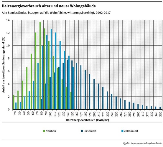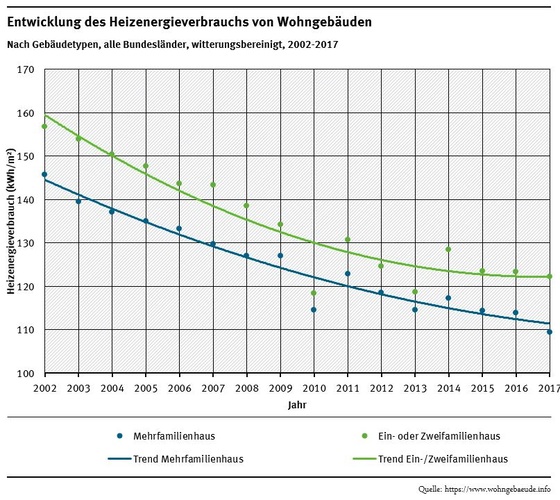 Als Kennwert für die Energieeffizienz von Wohngebäuden dient der Heizenergieverbrauch für Raumwärme und Warmwasser, bezogen auf die Wohnfläche und bereinigt von Witterungseinflüssen. Die Besonderheit der Daten: Sie verknüpfen gemessene Heizenergieverbräuche mit detaillierten Informationen über die Eigenschaften der Gebäude. Damit lassen sich Energieverbrauch und Modernisierungsstand von Wohngebäuden in Deutschland von 2002 bis heute beschreiben und auswerten.