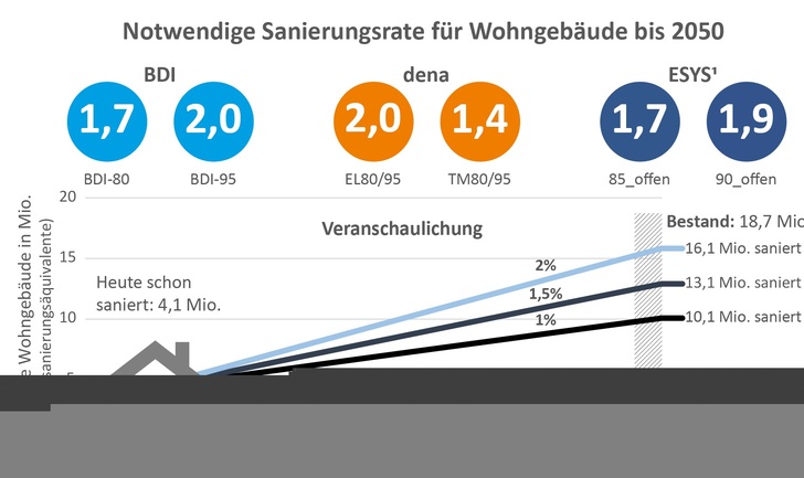 Bei der jährlichen Gebäudesanierungsrate sei eine Erhöhung von heute 1 %/a auf mindestens 1,4 bis 2,0 %/a (Vollsanierungsäquivalente) notwendig. Schließlich brauche Deutschland zum Erreichen ambitionierter Klimaziele im Jahr 2050 erneuerbare synthetische Energieträger im Umfang von 200 bis zu 900 TWh/a (aktuell liegt der Primärenergieverbrauch Deutschlands bei rund 3800 TWh/a).