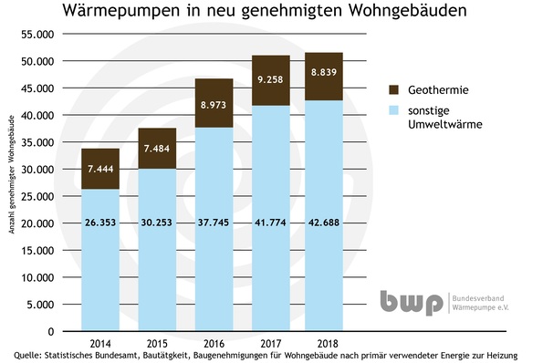 Mit einem Anteil von rund 46 % bei genehmigten Wohngebäuden hat das Heizungssystem Wärmepumpen nach den aktuellen Zahlen des Statistischen Bundesamts im Jahr 2019 den Spitzenplatz als primär verwendetes System zum Heizen verteidigt und den Vorsprung vor Heizsystemen mit dem Energieträger Gas weiter vergrößert.