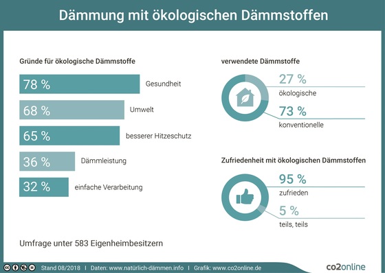 Eigenheimbesitzer, die bei einer Dämmung auf ökologische Dämmstoffe gesetzt haben, sind zu 95 % mit dem Ergebnis zufrieden. Das geht aus einer Umfrage von co2online für die Kampagne „Natürlich Dämmen“ hervor. Allerdings mangelt es offenbar an qualifizierten Handwerkern und Informationen über ökologische Dämmung.