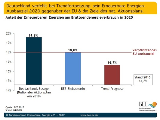 Deutschland droht neben seinen Klimaschutzzielen auch sein Erneuerbare-Energien-Ziel für 2020 deutlich zu verfehlen, so das Ergebnis einer Trend-Prognose des Bundesverbands Erneuerbare Energie (BEE). Besonders pikant: Wenn die Politik nicht rasch reagiert, wird Deutschland zu den wenigen EU-Staaten gehören, die das EU-Ziel verbummeln.