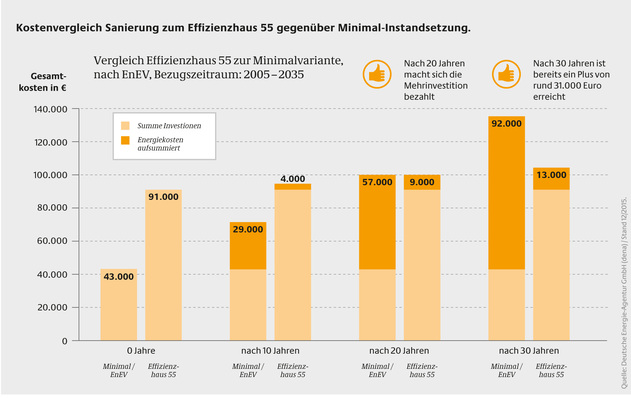 Die dena hat bei einem bereits vor zehn Jahren energieeffizient sanierten Haus von 1950 nachgerechnet und zeigt, dass sich die Sanierung zum Effizienzhaus gegenüber einer Minimal-Instandsetzung nach 20 Jahren finanziell rechnet.