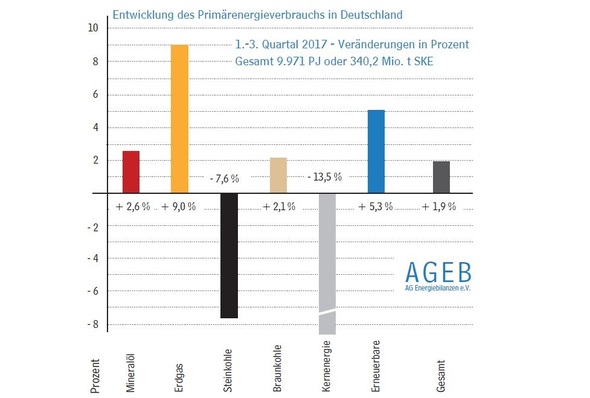 Der Primärenergieverbrauch in Deutschland wird 2017 gegenüber dem Vorjahr voraussichtlich um etwas mehr als 1 % steigen und eine Gesamthöhe von etwa 13.600 PJ erreichen. Diese Schätzungen hat die AG Energiebilanzen auf Basis der Daten für Januar bis September 2017 veröffentlicht.
