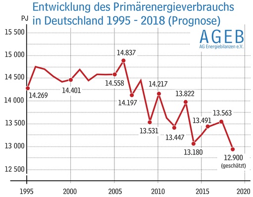 Der Energieverbrauch in Deutschland wird 2018 deutlich niedriger als im Vorjahr sein. Die Arbeitsgemeinschaft Energiebilanzen rechnet mit einem Rückgang um knapp 5 % auf rund 12.900 PJ. Noch etwas deutlich werden die CO2-Emissionen sinken.