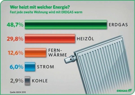 Nach Angaben der Verbraucherinformation Erdgas werden in Deutschland zurzeit 18,6 Mio. Wohnungen (48,7 %) mit Erdgas beheizt, Tendenz steigend. Heizöl deckt einen Anteil von 29,8 % ab, Tendenz sinkend. Geringfügig zulegen konnte Fernwärme mit einem aktuellen Anteil von 12,6 %. Der Anteil von...