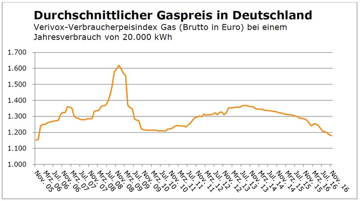 Die Gaspreise für Haushalte in Deutschland sind im November 2016 so niedrig wie seit über zehn Jahren nicht mehr. Und auch im kommenden Jahr werden die Gaspreise weiter sinken, weil die Versorger immer mehr Spielraum haben, günstige Beschaffungskosten weiterzugeben.