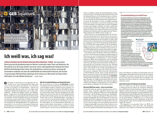 Nach dem Hochhausbrand des „Grenfell Tower“ mit vielen Toten und Verletzten wurde hierzulande rasch die Frage aufgeworfen, wie sicher unsere wärmegedämmten Gebäude bei einem ähnlichen Brandereignis wären. Spekulationen schossen ins Kraut. Ein Topaktuell in GEB 07/08-2017 arbeitet auf, wie sich Falschinformation in den Medien festgesetzt haben und bis heute ihre Wirkung entfalten.
