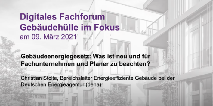 Im November 2020 hat das Gebäudeenergiegesetz die Energieeinsparverordnung und das ErneuerbareEnergienWärmegesetz EEG und das Energieeinsparungsgesetz abgelöst. Änderungen gab es bei den Anforderungen an die Gebäudehülle, aber auch bei Beratungsanforderungen und Energieausweisen. Im Vortrag erläutert Christian Stolte, Bereichsleiter Energieeffiziente Gebäude bei der Deutschen Energieagentur (dena) , worauf Fachunternehmen und Planer achten müssen.
