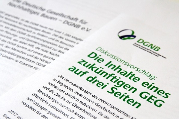 Eine auf drei Seiten komprimierte Alternative zum 2017 von der Bundesregierung erarbeiteten Entwurf eines Gebäudeenergiegesetzes wurde von der DGNB veröffentlicht. Zu den Kernforderungen zählt, dass die CO2-Emission eines Gebäudes zur Zielgröße wird und die Bewertung anhand absoluter Grenzwerte erfolgt.