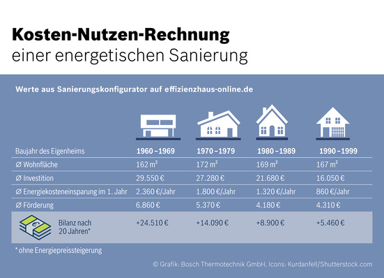 Statistisch lebt ein typischer Hausbesitzer, der über eine energetische Sanierung seines Eigenheims nachdenkt, in einem Vier-Personen-Haushalt auf rund 165 m2 – und rechnet mit zu hohen Sanierungskosten für seine Immobilie. Je nach Baujahr des Eigenheims liegt sein Budget zwischen 26.000 und 52.000 Euro. Tatsächlich sind die Investitionskosten aber im Durchschnitt deutlich niedriger.