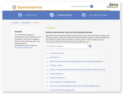 Der dena-Expertenservice stellt eine Toolbox mit Online-Instrumenten für die Energieberatung zur Verfügung. Sie umfasst bisher Informationen und Links zu Tools, mit denen sich z. B. U-Werte, Jahresarbeitszahlen oder die wichtigsten Kennwerte einer Photovoltaik-Anlage berechnen lassen. Weitere...