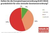 Laut einer Umfrage von kalaydo.de unter 1150 Verbrauchern und 380 Maklern erwarten nur 35 % der Käufer und Mieter von Immobilien mehr Transparenz bei Energieverbrauch und -bedarf durch die EnEV 2014. 53 % der Makler befürchten eine Preissteigerung bei Miet- und Kaufimmobilien.
