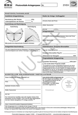 Um die hohe Qualität der Installation von Photovoltaik-Anlagen für den Kunden nachweislich zu dokumentieren, hat der BSW-Solar gemeinsam mit dem Zentralverband der Deutschen Elektro- und Informationstechnischen Handwerke (ZVEH) einen Anlagenpass entwickelt. Üblicherweise kann der Laie die...