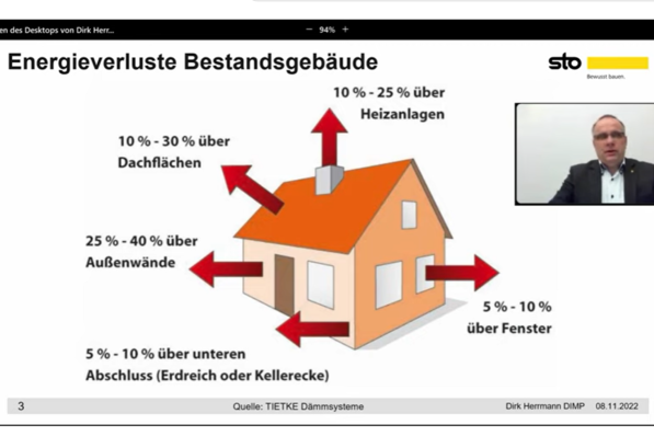 Der Vortrag von Dirk Herrmann Produktmanager national WDVS und VHF, befasst sich mit dem Holzfaserdämmmsystem StoTherm Wood und mit StoTherm AimS.
