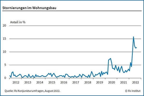 Im Wohnungsbau kommt es weiterhin vermehrt zu Auftragsstornierungen. Im August 2022 waren 11,6 % der vom ifo Institut befragten Unternehmen betroffen.