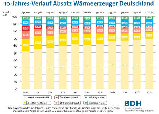 2019 sind in Deutschland 748.000 Wärmeerzeuger und damit 2 % mehr als im Vorjahr verkauft worden. Für 2020 ist die Heizungsindustrie optimistischer und erwartet aufgrund der verbesserten Förderanreize ein Wachstum von bis zu 10 % bei Systemen, die Effizienz und erneuerbaren Energien kombinieren.