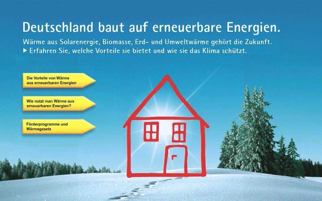 Deutschland baut auf erneuerbare Energien – unter diesem Motto informiert das Bundesumweltministerium seit Anfang Februar über die Förderangebote rund um das Erneuerbare-Energien-Wärmegesetz mit großformatigen Werbebannern, Anzeigen in überregionalen Tageszeitungen sowie mit Internet-Werbung...