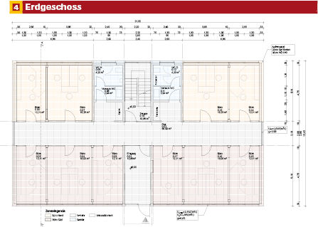 Die Technik wurde so gewählt, dass alle in der DIN V 18599 behandelten technischen Gewerke im Nachweis abgebildet werden können. So werden z.B. die südseitigen Büroräume (Abb.3) gekühlt, obwohl es sicher möglich und sinnvoll wäre, ein derartiges Gebäude so zu planen, dass auf eine zusätzliche Kühlung verzichtet werden kann. Um einen Anreiz dafür zu schaffen, ist in der EnEV 2007 der Primärenergiebedarf des Referenzgebäudes für Büroflächen zu Null gesetzt. Dies soll sich in der EnEV 2009 bereits wieder ändern.