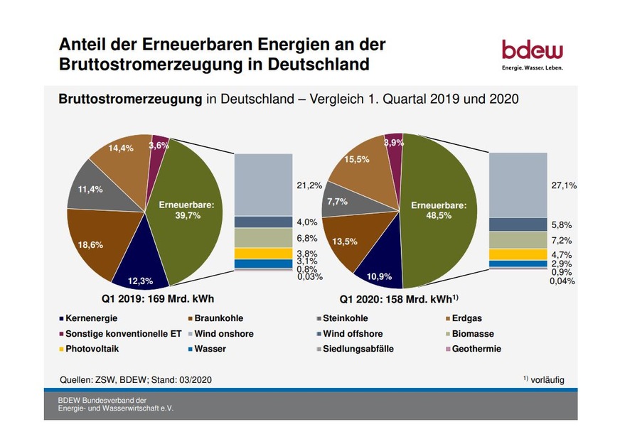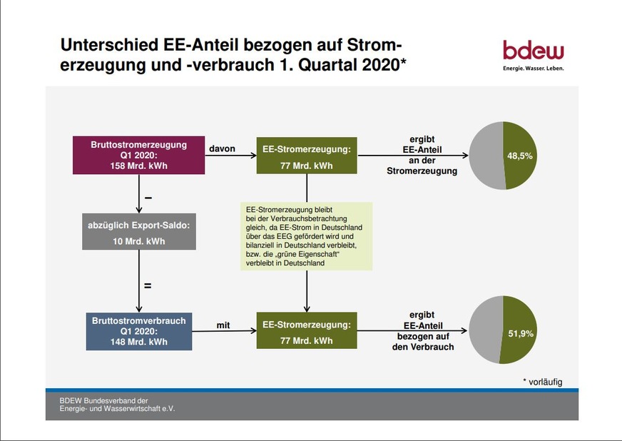 Eine andere Möglichkeit ist, den Anteil der Erneuerbaren Energien an der Bruttostromerzeugung zu messen. Sie umfasst die gesamte in Deutschland erzeugte Strommenge, also auch die exportierten Strommengen. Der Anteil erneuerbarer Energien im ersten Quartal 2020 auf Basis der Brutto-Stromerzeugung beträgt rund 49 %.