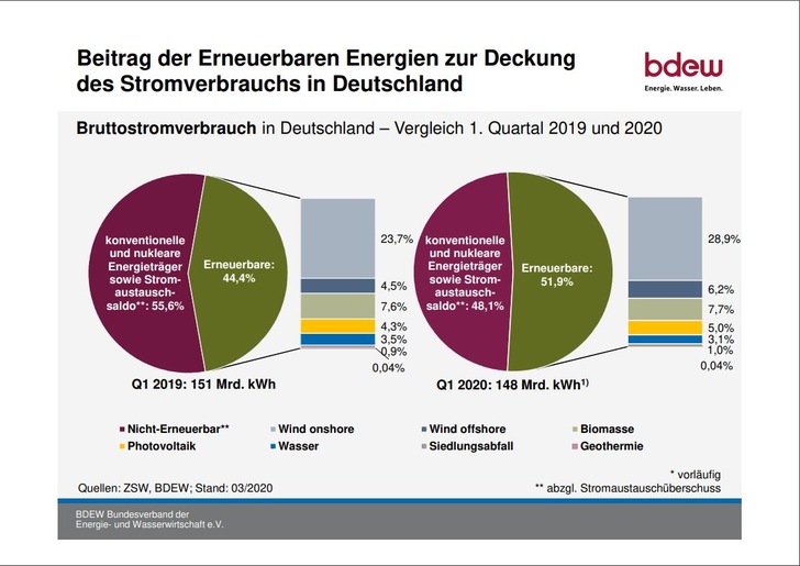 Auf den „Wind-Rekord“ im Februar folgte der März mit außergewöhnlich vielen Sonnenstunden. Hinzu kam ein Rückgang des Stromverbrauchs um 1 % gegenüber dem Vorjahreszeitraum. Dies wurde ausgelöst durch eine vergleichsweise schwache Konjunktur sowie einen Rückgang der Industrieproduktion in der letzten Märzwoche aufgrund der Corona-Krise. Der Einspeisevorrang für die Erneuerbaren Energien führte zusammen mit Kraftwerks-Stilllegungen (Ende 2019) zu einer deutlich reduzierten Einspeisung konventioneller Energien. Die Kombination dieser Faktoren ermöglichte es, den Erneuerbaren in den ersten 3 Monaten über die Hälfte des Stromverbrauchs zu decken (Q1 2019: 44,4 %). Angesichts dieser Sondereffekte lässt sich daraus jedoch keine Ableitung für das Gesamtjahr 2020 treffen – zumal das 1. Quartal witterungsbedingt regelmäßig eine höhere Erneuerbaren-Quote aufweist.