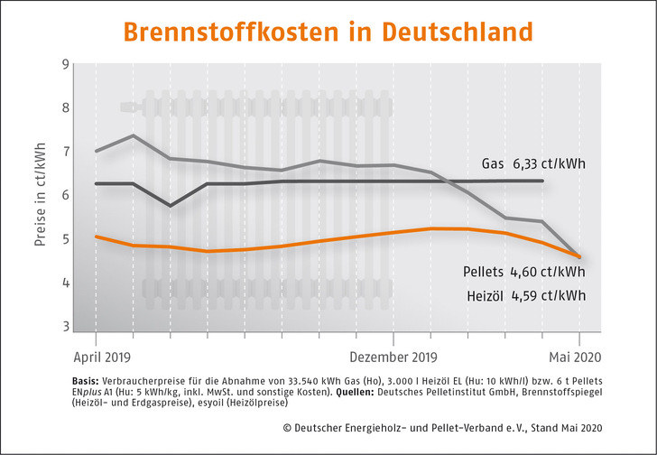 Der DEPV gibt dementsprechend einen Kilopreis von 23,02 Cent bekannt, eine Kilowattstunde (kWh) Wärme aus Pellets kostet 4,60 Cent. Der Preis von Heizöl liegt erstmals seit April 2016 wieder unter dem von Pellets, auch wenn der Preisnachteil mit 0,4 % sehr gering ist. Zu Erdgas halten Pellets einen Preisvorteil von rd. 27 %.