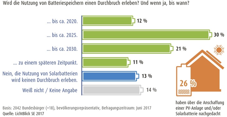 Etwa 7 % der Befragten sind beim Thema PV-Strom und Solarspeicher selbst aktiv geworden: Sie haben bereits eine Solaranlage und/oder einen Speicher installiert. Fast ein Fünftel der Bürger denkt über eine Installation nach. Im Vergleich zu 2015 ist dieser Anteil leicht gestiegen. Vor zwei Jahren gaben 6 % der Befragten an, eine PV-Anlage und/oder einen Speicher im Haus zu haben und 16 % haben über einen Einbau nachgedacht.